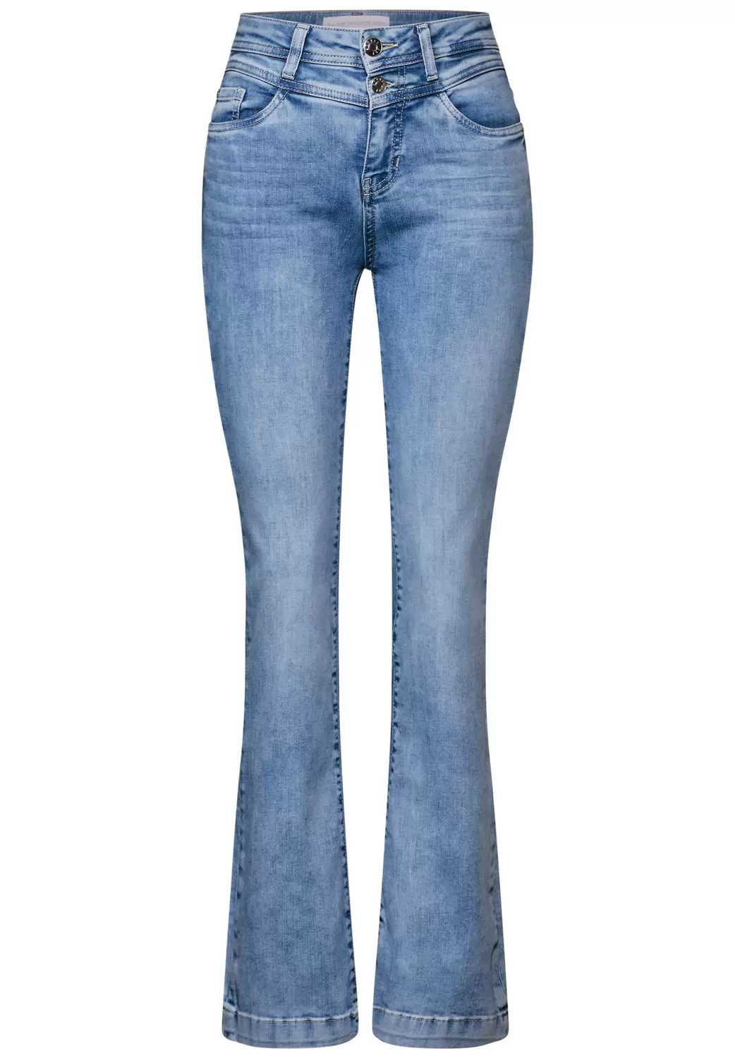 Die Bootcut Jeans im Slim Fit von Street One für Damen überzeugt mit einer figurschmeichelnden Passform sowie High Waist und ausgestellten Beinen. Die hellblaue Denim Waschung verleiht der Jeanshose einen modischen Look, während der Baumwollmix mit Stretchanteil für hohen Tragekomfort sorgt und die Jeans so zu deinem idealen Alltagsbegleiter macht. Jeanshose im Slim Fit High Waist und Bootcut Legs Hellblaue Denim Waschung 5-Pocket Baumwollmix mit Stretchanteil Material: 89% Baumwolle, 8% Polyester, 3% Elasthan