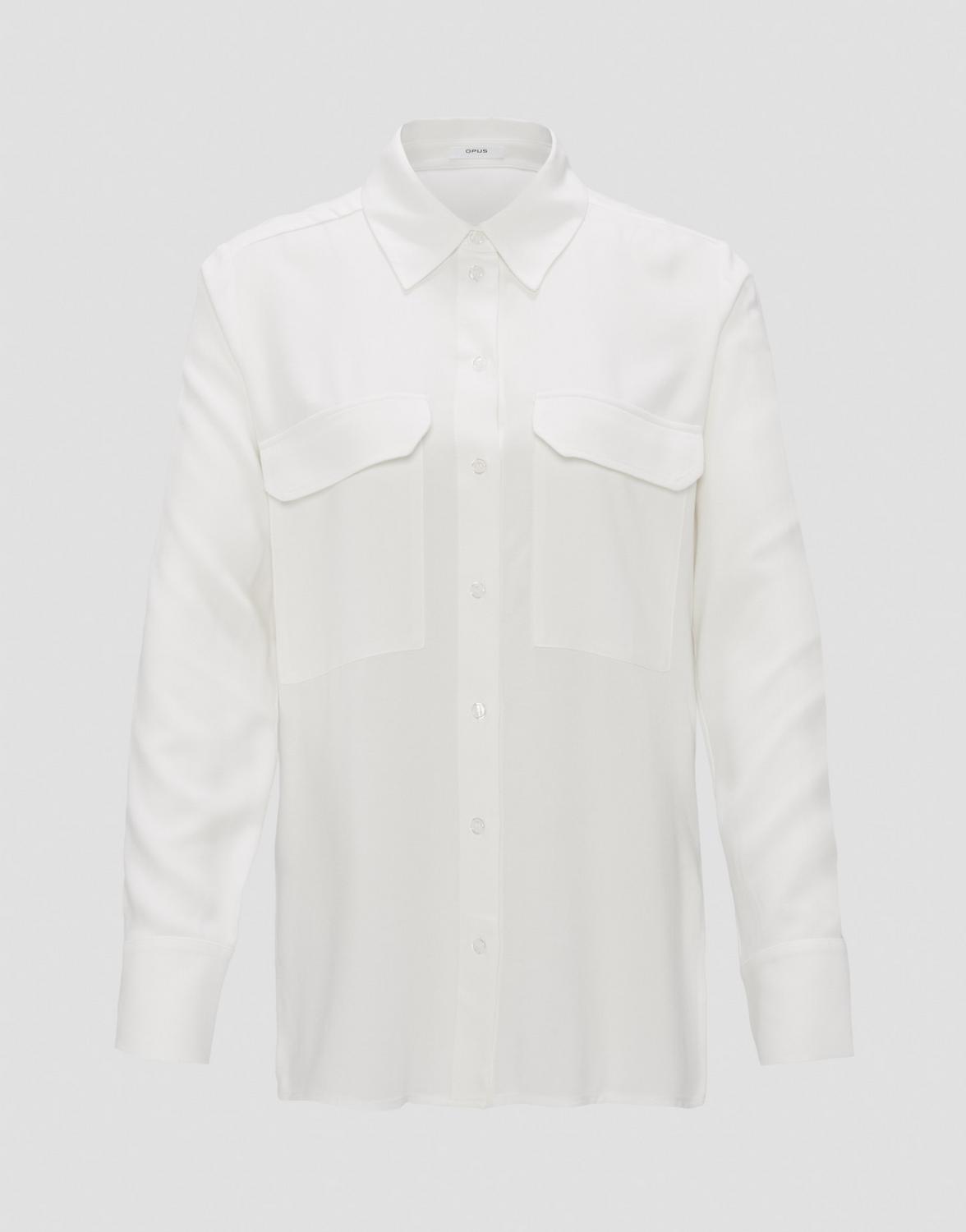 Die Longbluse lebt von spannungsvollen Gegensätzen wie die großen Utility Taschen auf einer weichen Ware. Durch die längere Silhouette eignet sich die Bluse perfekt zum Layern.