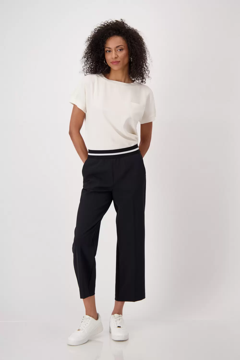 Die Hose mit Gummiband besteht aus elastischem Material und hat einen geraden Schnitt. Sie ist verkürzt und verfügt über praktische seitliche Eingrifftaschen.
