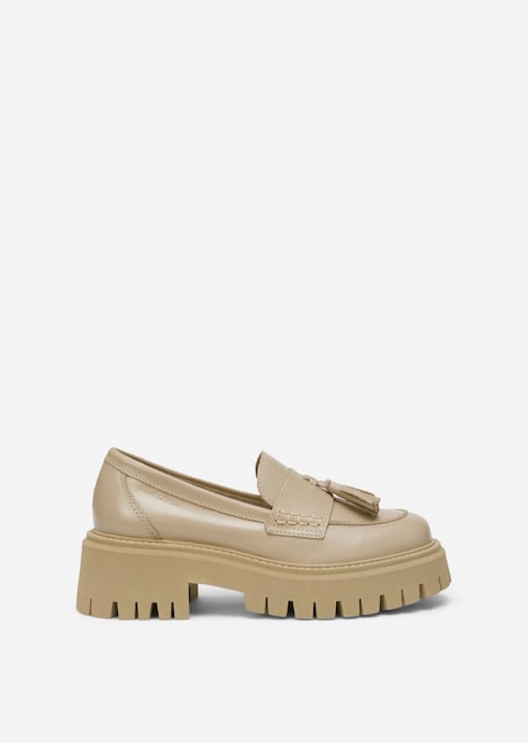 Klassiker und Trend-Schuh für jeden Tag: der hochwertige Loafer mit feiner Leder-Quaste aus edlem Rindsleder, das aus LWG-zertifizierten Gerbereien stammt. Sommerlich leicht und ungefüttert kommt er mit weich gepolsterter, komfortabler Innensohle aus Mikrofasern mit goldfarbener Logo-Prägung. Mit Mokassinnaht und einer leichten TR-Laufsohle mit seitlichen Rillen und starkem Profil im Bulky-Style. In hellen Naturtönen erhältlich.