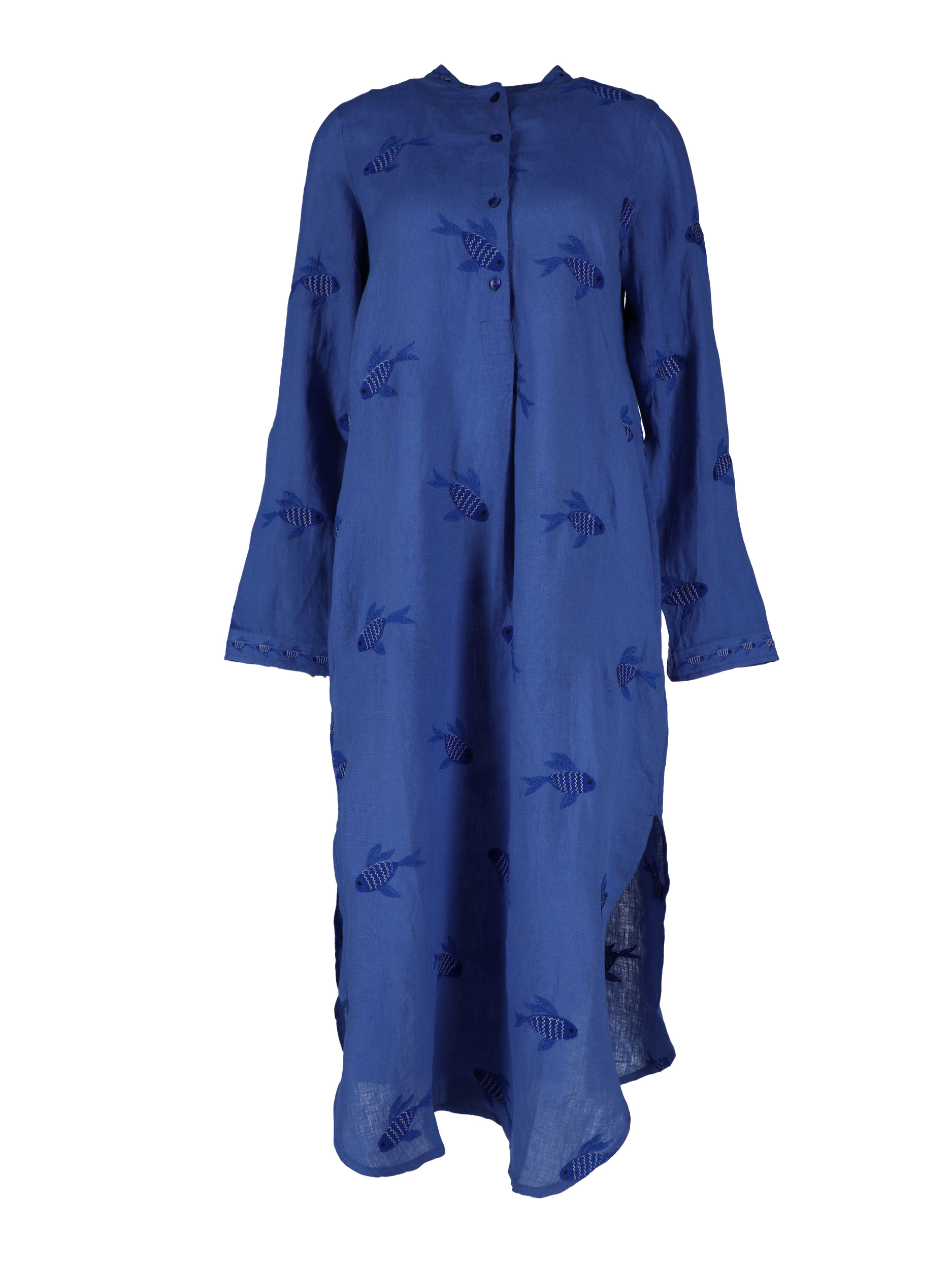 Der Nimo with Love Cedar Kaftan in der Farbe Fish on Blue vereint sommerliche Leichtigkeit mit einem Hauch Boho-Eleganz. Der locker geschnittene Kaftan aus 100 % hochwertigem Leinen besticht durch seine angenehme Midi-Länge und detailverliebte Stickereien im Fisch-Design. Das frische Blau wirkt klar und modern – perfekt für sonnige Tage, Urlaube oder entspannte City-Looks.