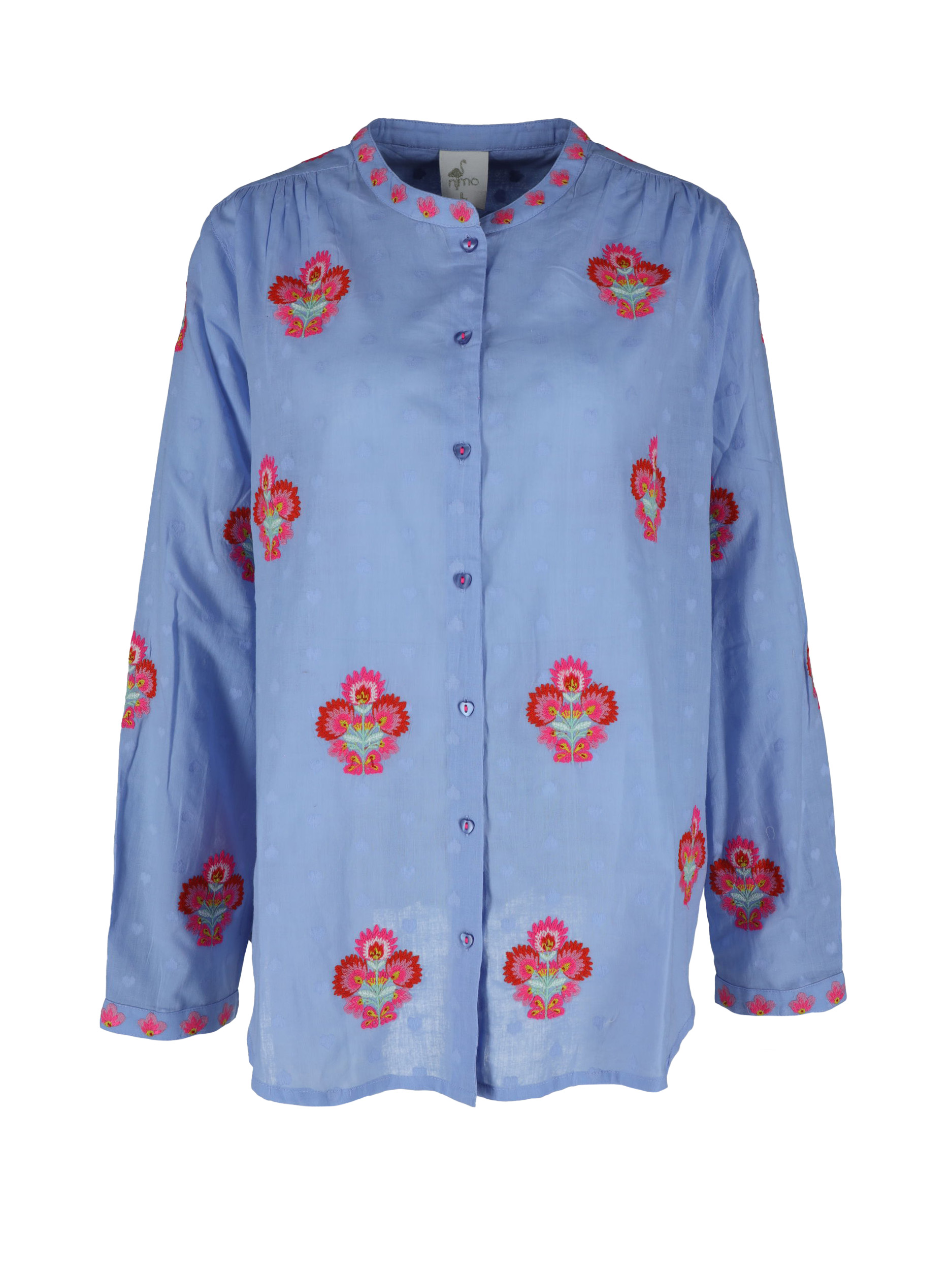 Mit ihrer weiten, fließenden Passform und der vollständigen Knopfleiste ist die Bluse vielseitig kombinierbar – ob offen über einem Top oder geschlossen zur Stoffhose. Der Stehkragen setzt das Dekolleté stilvoll in Szene und wirkt besonders harmonisch in Kombination mit zusammengebundenem Haar und Statement-Accessoires. Die langen Ärmel mit zarten Rüschenabschlüssen verleihen dem Design einen femininen Abschluss.