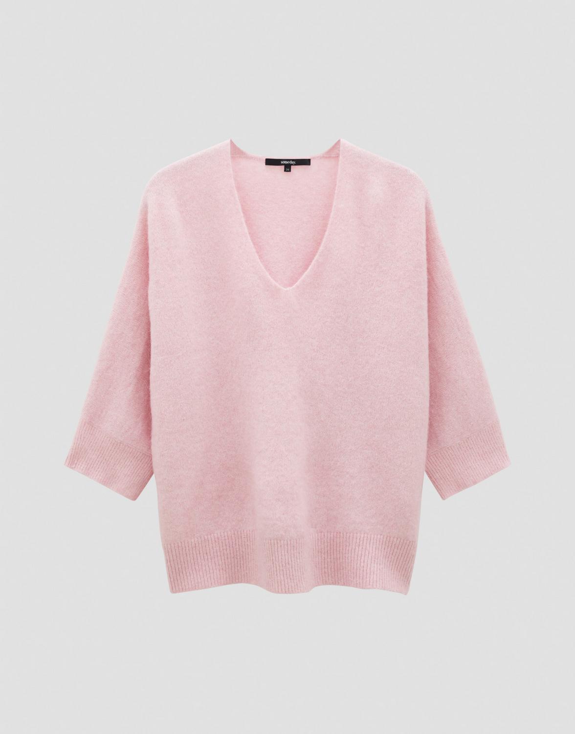 Dieser flauschige Strickpullover lässt sich durch den verkürzten Arm optimal in der Übergangssaison zum Herbst tragen.