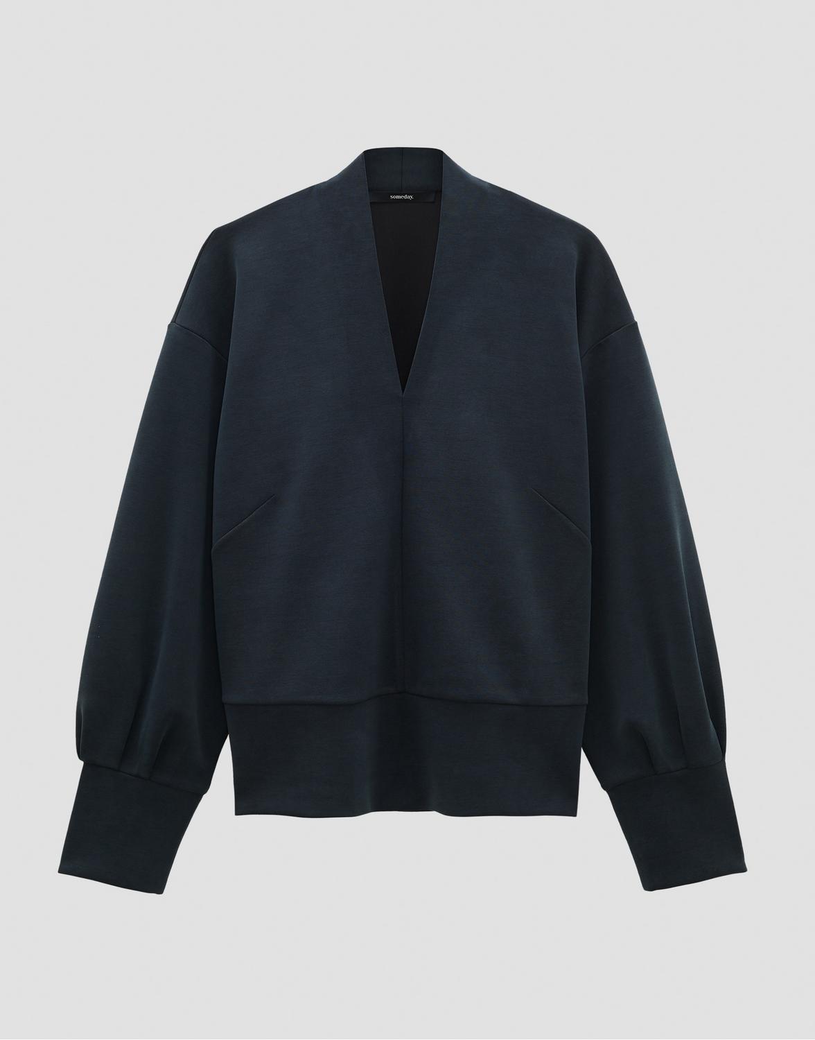 Der Sweater besticht mit einer extrem weichen Oberfläche und setzt mit voluminösen Ärmeln ein feminines Statement.